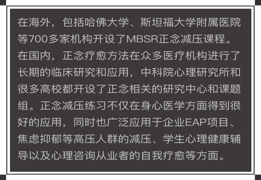 经由正念练习,也许你会觉察到自己对于“一定要拥有一个好睡眠”的过度执着与努力,在练习中,我们可以试着从过度执着和费力改变的情绪与想法漩涡中抽离岀来,给自己足够的空间,找回身体原本自然就拥有的睡眠能力。